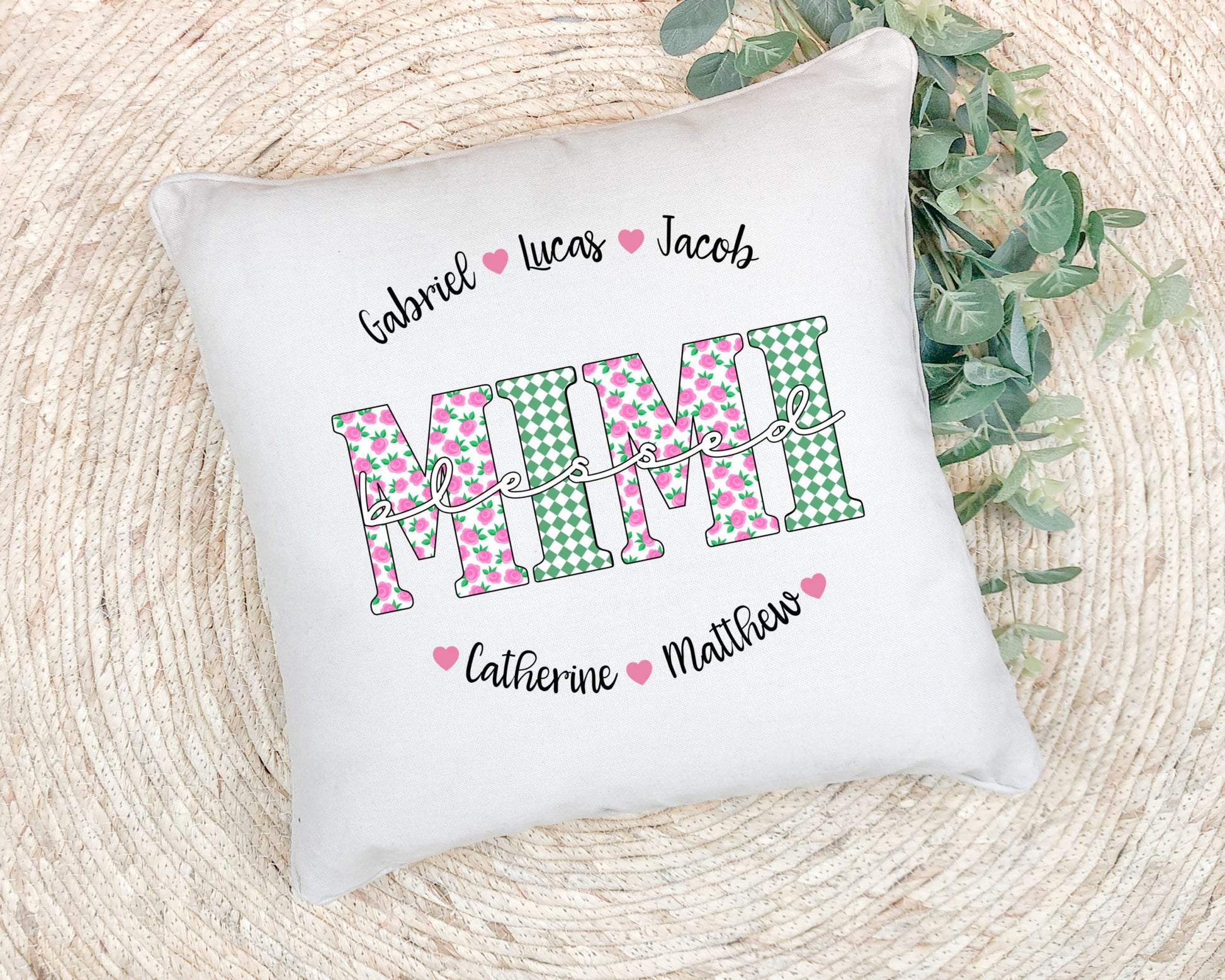 Personalized Blessed Mom Grandma Nana Name Pillow With Pink Green Flower