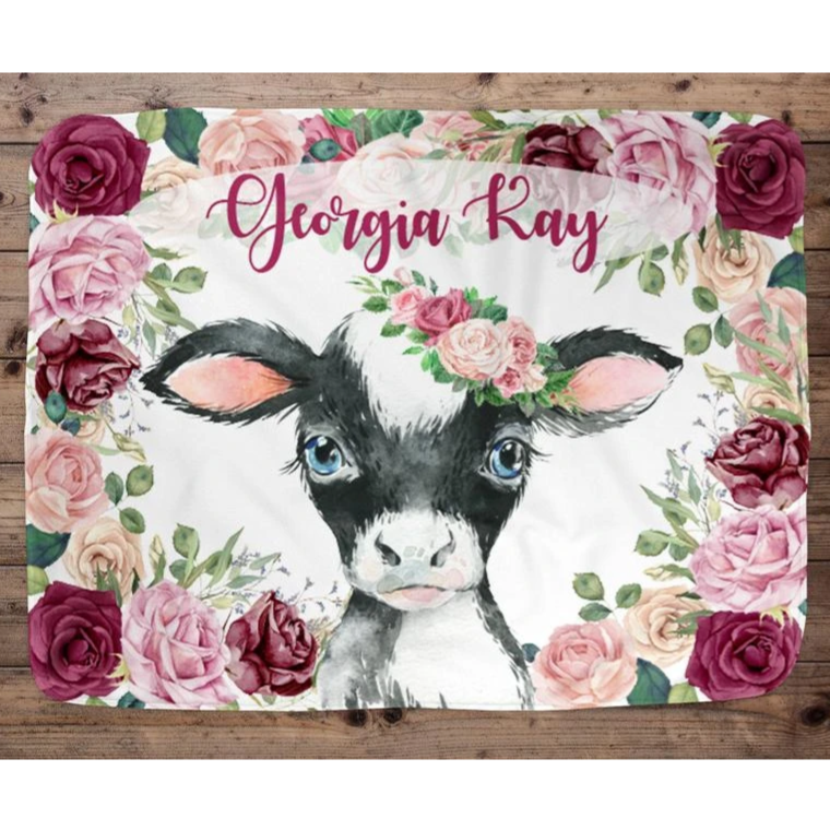 Personalized Cow Pink Flower Muti Styles Newborn Baby Girl Children Name Fleece Blanket
