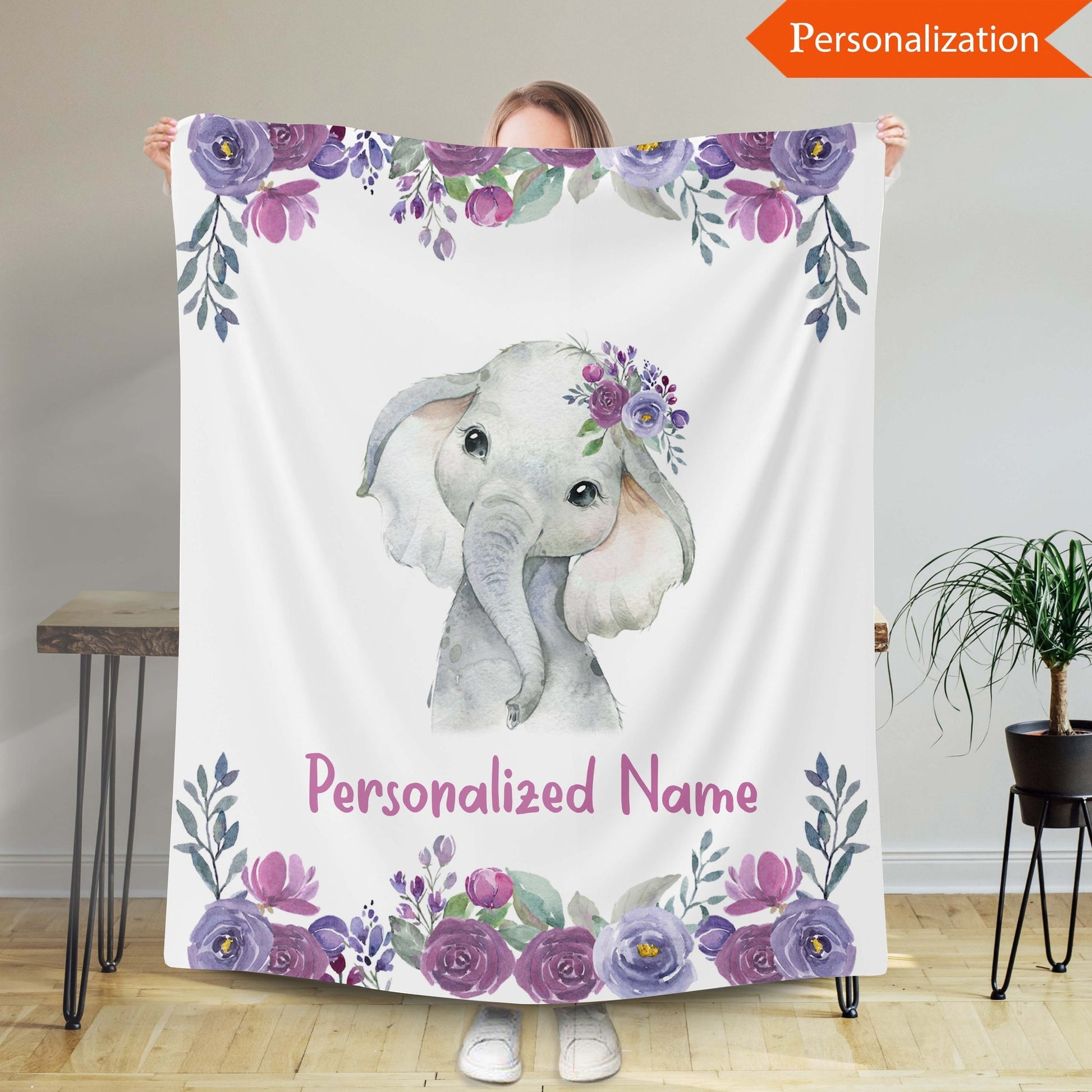Personalized Elephant Purple Flower Newborn Baby Girl Children Name Fleece Blanket | 110822